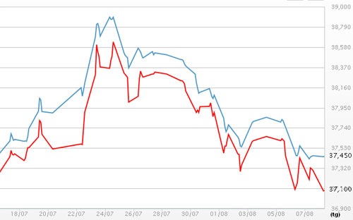 Hơn 10h trưa nay, Tập đoàn DOJI báo giá vàng SJC cho thị trường Hà Nội ở mức 37,1 triệu đồng/lượng (mua vào) và 37,45 triệu đồng/lượng (bán ra). So với cuối giờ chiều hôm qua, giá vàng SJC của doanh nghiệp này hiện giảm 200.000 đồng/lượng ở chiều mua, nhưng đi ngang ở chiều bán.