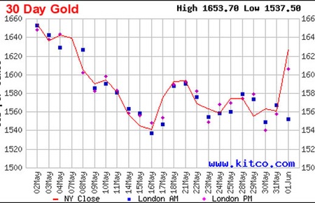 Kết thúc tuần qua, giá vàng giao tháng 8 trên sàn NYMEX đạt mức 1.622,1 USD/oz, tăng 3,2% trong tuần. Giá vàng giao ngay trên sàn Kitco chốt tuần ở mức 1.627,3 USD/oz, tăng 3,5%.