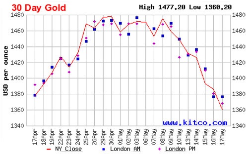 Vàng đã giảm giá mạnh trong phiên giao dịch ngày thứ Sáu của tuần này. Trên bộ phận COMEX của Sở Giao dịch hàng hóa New York (NYMEX), giá vàng giao tháng 6 chốt ở mức 1.364,7 USD/oz, giảm 5% trong tuần.