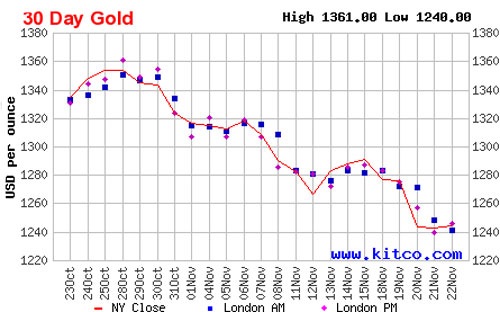 Sự suy yếu của giá vàng gia tăng kể từ giữa tuần này sau khi biên bản cuộc họp tháng 10 của Cục Dự trữ Liên bang Mỹ (FED) được công bố cho thấy, FED có thể cắt giảm quy mô của chương trình nới lỏng định lượng QE3 trong thời gian sớm. Trong phiên giao dịch ngày thứ Năm, giá vàng đã giảm xuống dưới ngưỡng hỗ trợ then chốt 1.250 USD/oz, ngưỡng mà nhiều chuyên gia cho là quan trọng để giá vàng duy trì được cận dưới của vùng biên độ hiện tại.