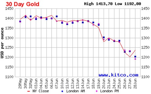 Nửa đầu năm 2013 đã khép lại, với vàng và bạc là hai tài sản mất giá nghiêm trọng nhất trên thị trường hàng hóa cơ bản. Trong phiên giao dịch ngày thứ Sáu vừa rồi, giá vàng giao tháng 8 tại bộ phận COMEX của Sở Giao dịch hàng hóa New York (NYMEX) dừng ở mức 1.223,7 USD/oz, giảm 5,3% trong tuần. Vàng đã rẻ đi 23% trong quý 2 và mất giá 27% kể từ đầu năm. Bạc giảm giá 2,7% trong tuần này, 31% trong quý 2 và 35% từ đầu năm.