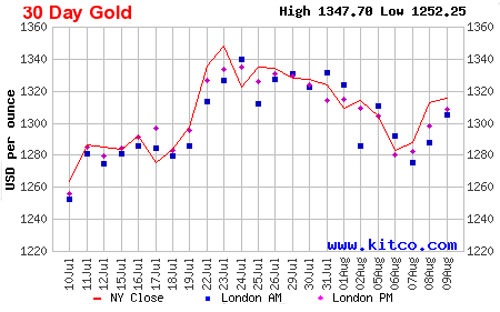 Diễn biến giá đóng cửa vàng giao ngay tại New York trong 1 tháng qua - Nguồn: Kitco.