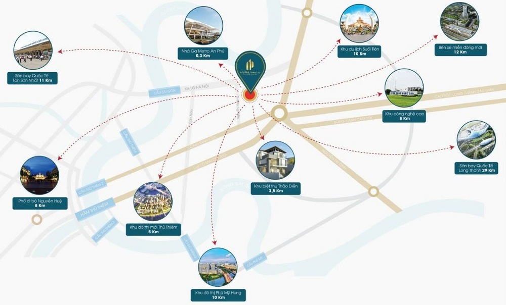 Được sở hữu vị trí chiến lược, từ đây cư dân An Phu New City chỉ mất 5 – 10 phút tới khu trung tâm đô thị mới Thủ Thiêm thông qua Đại lộ Mai Chí Thọ và liên kết đến trung tâm Quận 1 thông qua hầm Thủ Thiêm, chỉ mất 30 phút để di chuyển đến Sân bay Quốc tế Tân Sơn Nhất. Đặc biệt hơn trong lương lai sẽ kết nối trực tiếp tới sân bay Quốc tế Long Thành thông qua cao tốc Long Thành – Dầu Giây.