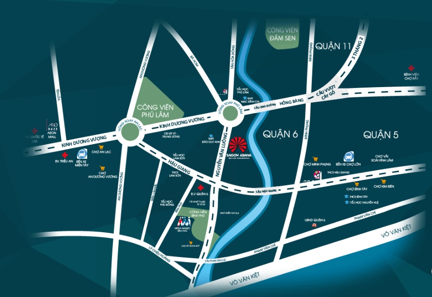 Với hạ tầng hiện hữu và đồng bộ, từ Saigon Asiana, cư dân có thể dễ dàng di chuyển đến quận 5, quận 1 chỉ từ 5 - 15 phút theo tuyến đại lộ Võ Văn Kiệt, cũng như quận 11, Tân Phú, Tân Bình với khoảng cách tương đương.