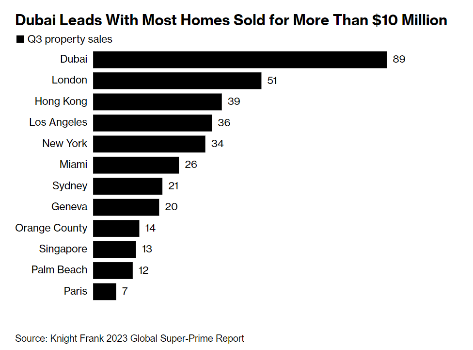 Trong khi đó, Dubai đã vượt qua sự suy thoái nói chung với 89 căn nhà trên 10 triệu USD được chuyển nhượng thành công, tăng từ 58 căn trong quý 3 năm 2022. Geneva và Hồng Kông cũng chứng kiến mức tăng nhẹ.