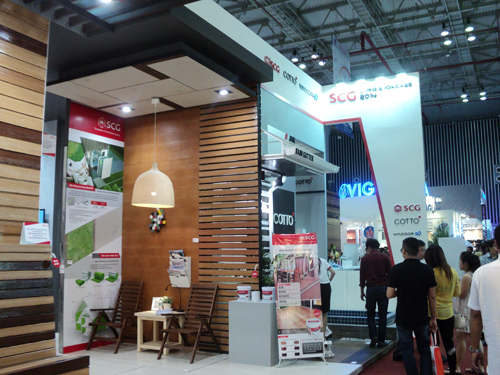 Gian hàng của Tập đoàn chuyên về vật liệu xây dựng SCG. Ông Jaturong Kurowat – Tổng giám đốc Công ty Ngói bê Tông SCG, một công ty thành viên của SCG cho biết, tại Vietbuild năm nay công ty giới thiệu bộ sưu tập các sản phẩm vật liệu xây dựng cao cấp với 3 thương hiệu: SCG, COTTO và Windsor. Các sản phẩm mới của SCG được giới thiệu tại triển lãm bao gồm: Thanh ốp tường SCG Smart, Wood Modeena Series, SCG Smartboard cho trần nhà - Tembusu Flower Series, bộ sưu tập COTTO dành cho phòng tắm, hệ thống mái che, ván sàn và máng xối cho không gian ngoài trời,…