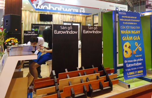 Gian hàng Eurowindow với các sản phẩm cửa uPVC, cửa nhôm, vách nhôm kính, cửa gỗ,… Một trong những sản phẩm mới được Eurowindow giới thiệu ở Vietbuild năm nay là cửa gỗ 4 cánh gấp trượt.