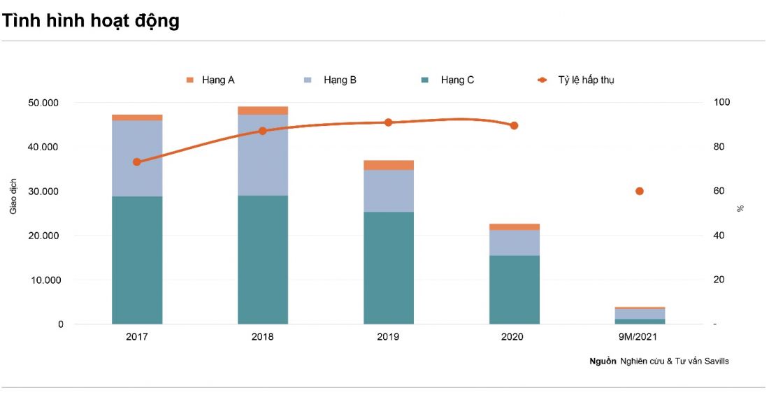 Số liệu của Hội Môi giới BĐS Việt Nam cho thấy, riêng quý 2/2021, tại TP.HCM, căn hộ trung cấp chiếm tỷ trọng 19% tổng nguồn cung có tỷ lệ hấp thụ tốt nhất với 72,7%. Trong khi đó, phân khúc căn hộ cao cấp chiếm 77% tổng nguồn cung có tỷ lệ hấp thụ thấp nhất, chỉ đạt 10%, do giá bán vượt xa thu nhập của người dân.