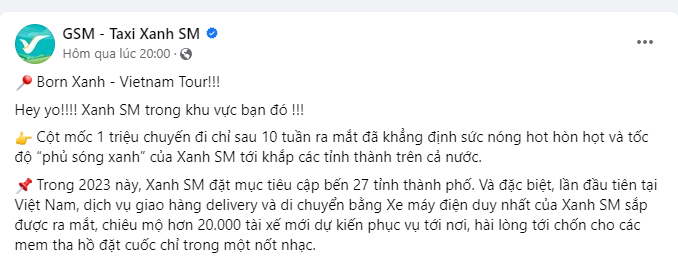 Hôm 17/7, fanpage Facebook của GSM của Công ty CP Di chuyển Xanh và Thông minh) - công ty do tỷ phú Phạm Nhật Vượng thành lập đăng thông báo mục tiêu trong năm 2023 là đưa dịch vụ taxi điện cập bến 27 tỉnh, thành phố.