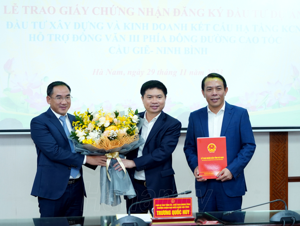 Chiều 29.11, UBND tỉnh Hà Nam tổ chức hội nghị trao Giấy chứng nhận đăng ký đầu tư Dự án “Đầu tư xây dựng và kinh doanh kết cấu hạ tầng Khu công nghiệp hỗ trợ Đồng Văn III phía Đông đường cao tốc Cầu Giẽ - Ninh Bình” cho nhà đầu tư dự án.