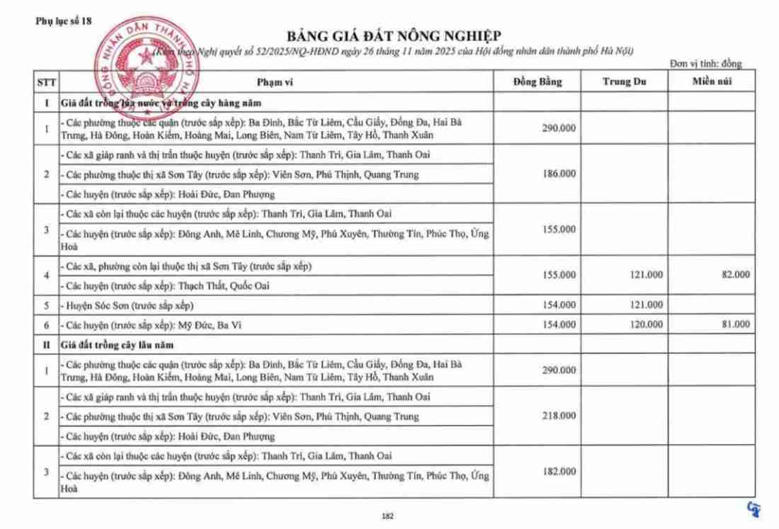 Mức giá cao nhất là 290.000 đồng/m2, áp dụng đồng loạt cho đất trồng lúa, đất trồng cây hàng năm và đất trồng cây lâu năm tại các phường thuộc các quận (trước sắp xếp) như: Ba Đình, Bắc Từ Liêm, Cầu Giấy, Đống Đa, Hai Bà Trưng, Hà Đông, Hoàn Kiếm, Hoàng Mai, Long Biên, Nam Từ Liêm, Tây Hồ, Thanh Xuân. Đây cũng là nhóm địa bàn dẫn đầu bảng giá trong nhiều kỳ định giá gần đây.
