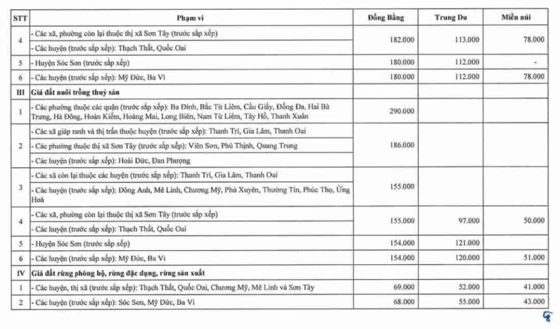 Đối với vùng trung du và miền núi, mức giá bắt đầu giảm đáng kể, dao động từ 50.000-121.000 đồng/m2 tùy loại đất và từng khu vực như Mỹ Đức, Ba Vì, Sóc Sơn. Dù giá thấp hơn so với trung tâm, nhưng những khu vực này được dự báo còn nhiều dư địa tăng nhờ quy hoạch sinh thái - du lịch và các dự án hạ tầng mới.