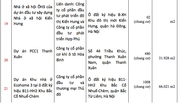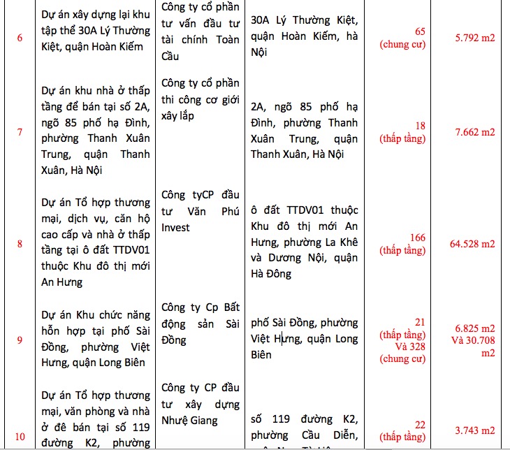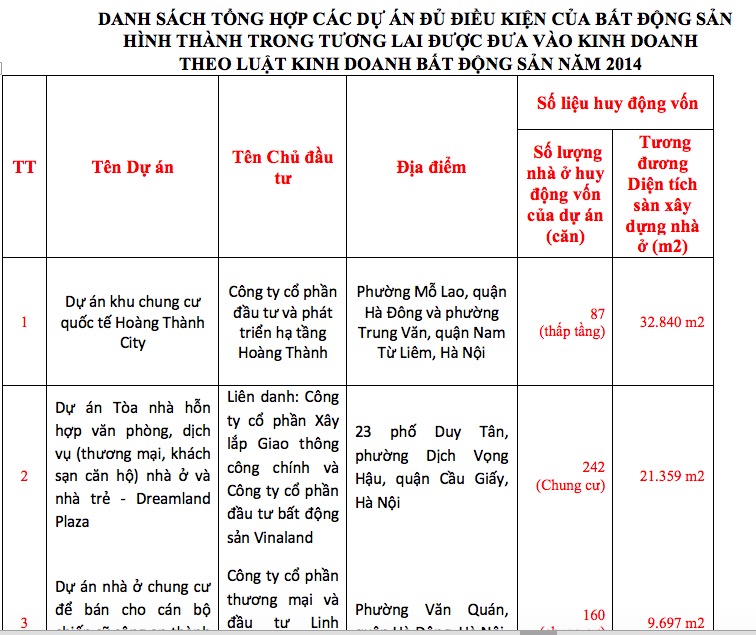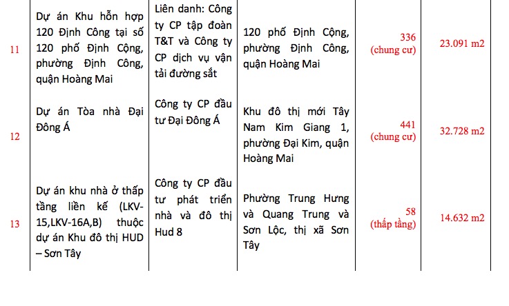 Công ty cổ phần đầu tư và phát triển hạ tầng Hoàng Thành đủ điều kiện mở bán 87 căn thấp thầng tại Dự án khu chung cư Quốc tế Hoàng Thành City (Mỗ Lao, Hà Đông); Tập đoàn thương mại Tuấn Dung đủ điều kiện mở bán 178 căn thấp tầng tại dự án đầu tư xây dựng công trình theo quy hoạch xã Ninh Hiệp; Dự án khu đô thị Thạch Bàn với 69 căn thấp tầng…