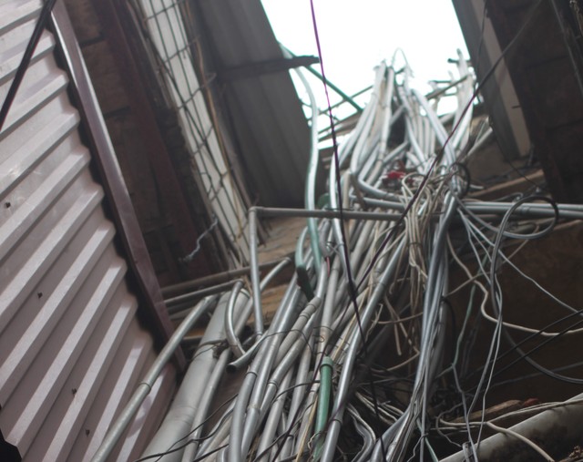 Chúng tôi không khỏi rùng mình khi nhìn thấy hàng trăm đường ống nước bò khắp bề mặt tòa nhà. Bà Thu đứng chỉ: “Đây là ống nước toilet nhà tầng 3, đây là đường nước máy của nhà tầng 4…”. Hàng chục đường ống to nhỏ được bó chung lại với nhau, các đường ống chạy ngang, dọc dày đặc như ma trận. Những đồng hồ nước cũng được đặt nằm ngổn ngang ngay lối lên cầu thang chung, nhiều chiếc nắp đã han rỉ, cái không còn nắp, cái nằm vùi dưới lớp rác thải. Bà Thu bảo, phía dưới những đồng hồ nước kia là hố ga của tòa nhà. Ngày mưa, phân tươi vẫn dềnh lên, những nhà ở tầng 1 lĩnh đủ. Các nhà tầng 2 trở lên không có việc gì thì không ra khỏi nhà, nếu ai ra ngoài phải có ủng đi.