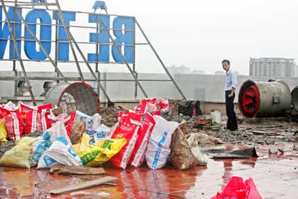 “Công trường” sửa chữa thấm dột tại tầng thượng tòa nhà CT1 Ngô Thì Nhậm (ảnh chụp ngày 26/9). ảnh: L.M