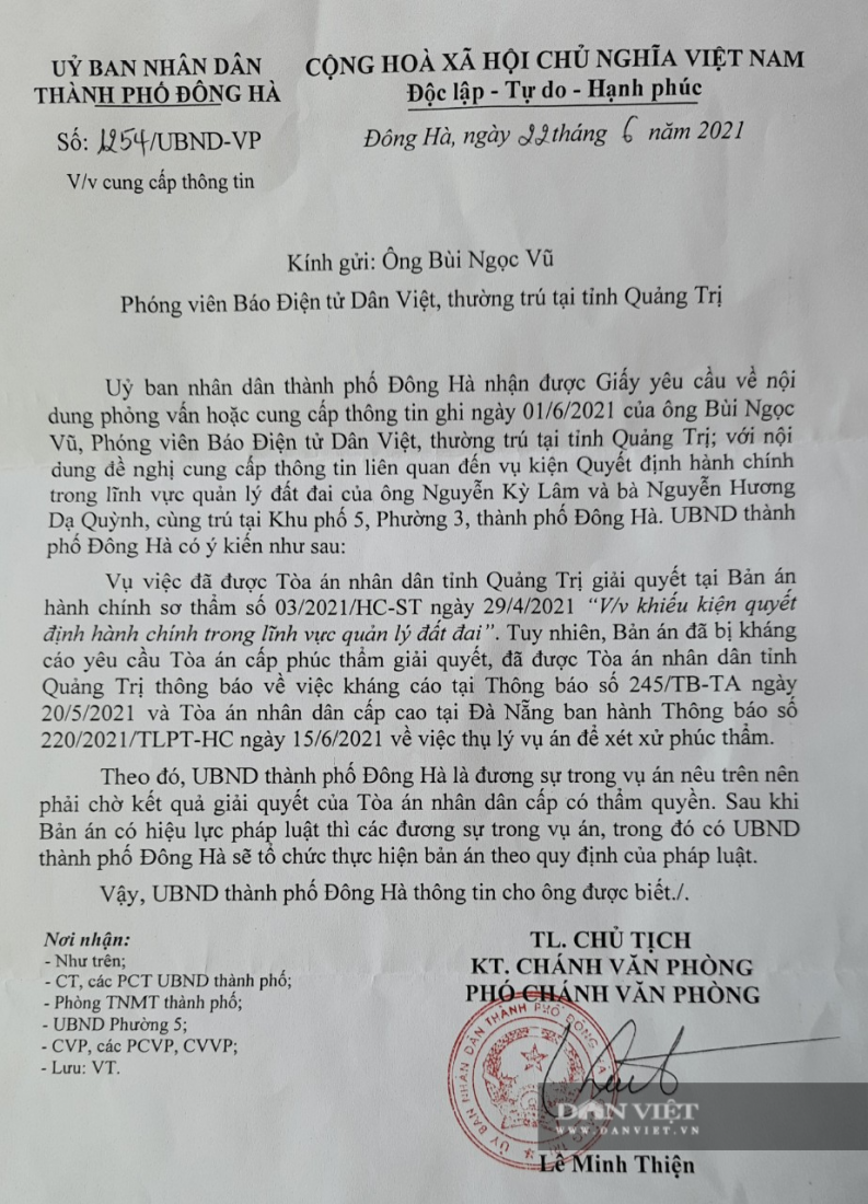 Đến ngày 22/6, ông Lê Minh Thiện thừa lệnh Chủ tịch UBND TP.Đông Hà, ký thay Chánh Văn phòng gửi văn bản số 1254/UBND-VP đến PV Dân Việt để trả lời.