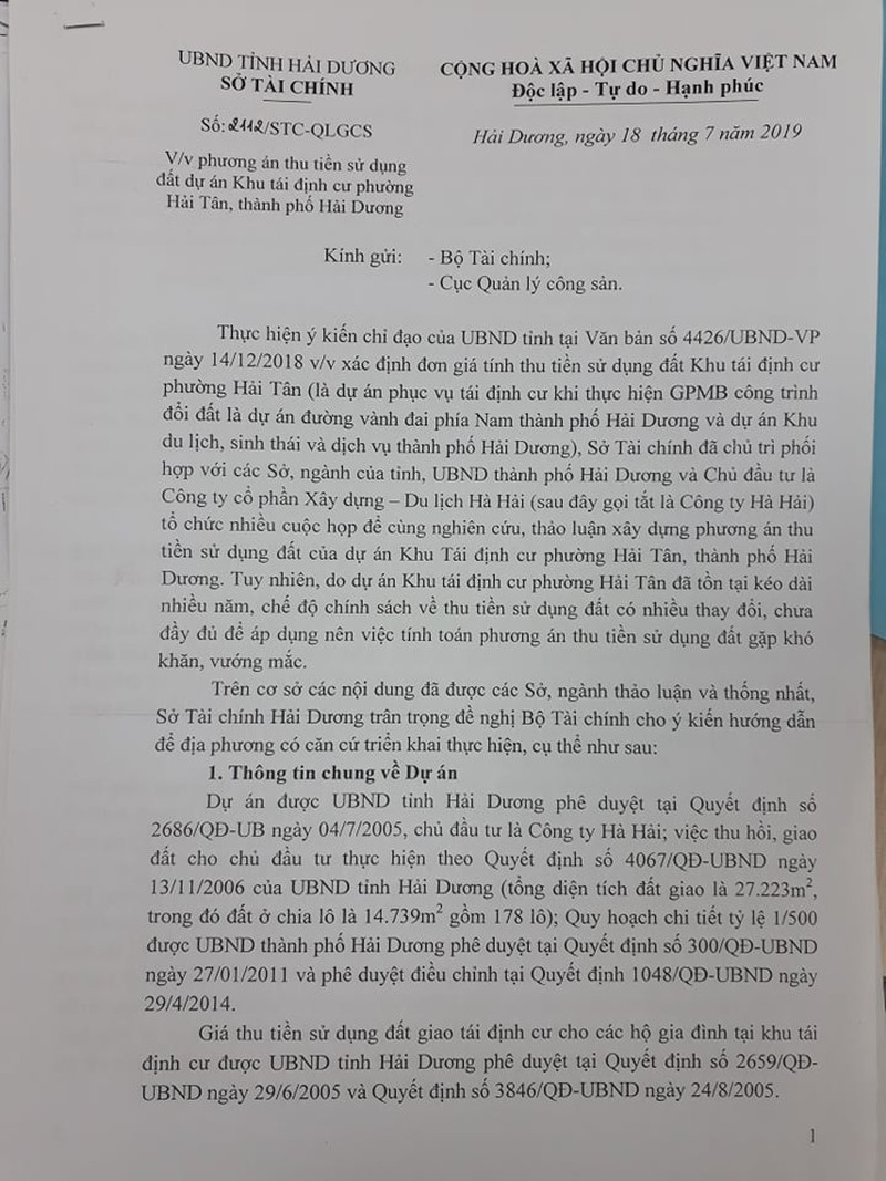 Sau khi có văn bản hướng dẫn của Bộ Tài chính, Sở Tài chính sẽ hoàn thiện phương án thu tiền SDĐ Dự án khu TĐC trình UBND tỉnh xem xét, phê duyệt để nhà đầu tư thực hiện nghĩa vụ tài chính theo quy định. Tuy nhiên, đến nay đã gần 1 năm trôi qua mà Sở Tài chính Hải Dương vẫn chưa nhận được phản hồi từ Bộ Tài chính, khiến cho hơn 100 hộ dân vẫn mòn mỏi “chờ sổ đỏ”.