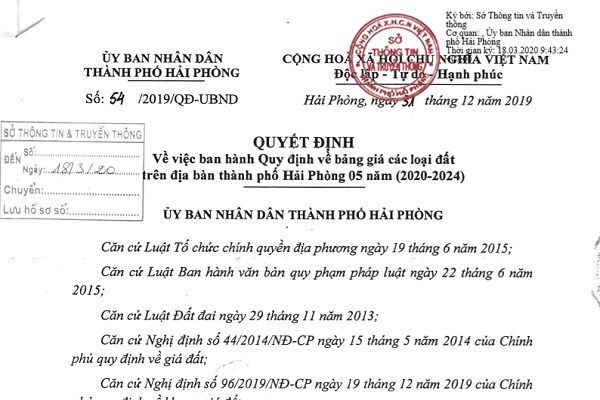 Ngày 18/3, UBND TP Hải Phòng đã ban hành Quyết định số 54/2019/QĐ-UBND ngày 31/12/2019 Quy định về bảng giá các loại đất trên địa bàn thành phố Hải Phòng 05 năm (2020-2024).