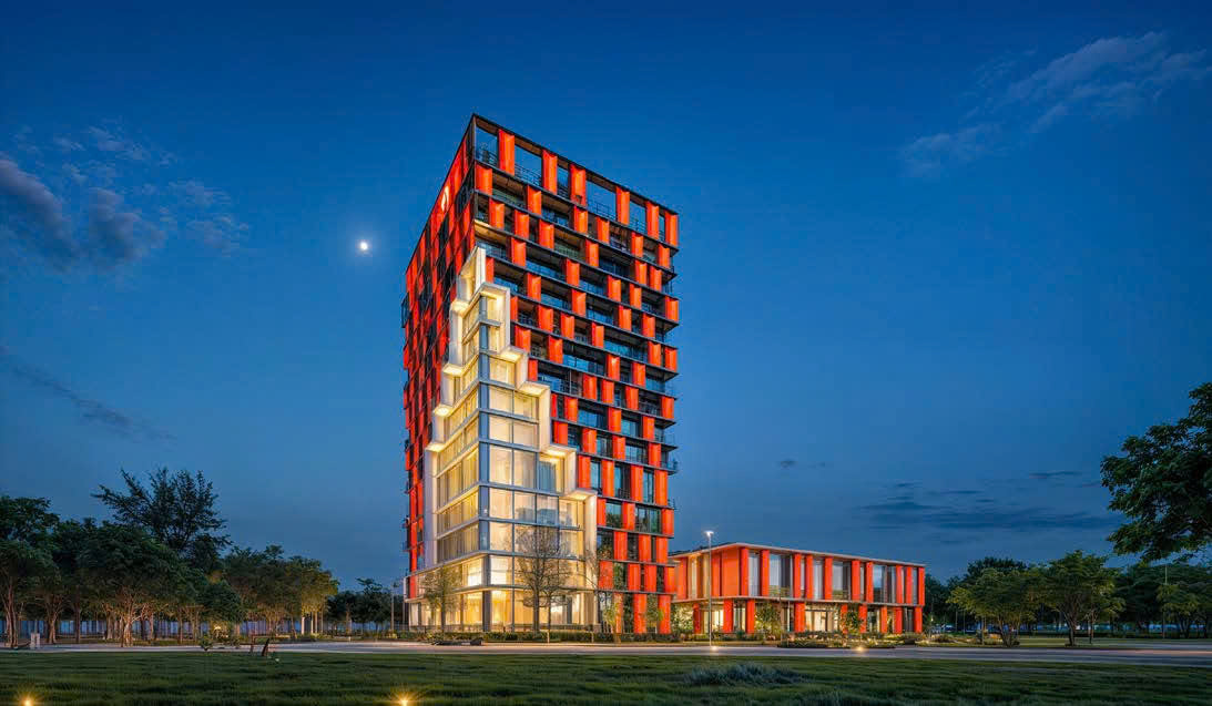 Điểm nhấn kiến trúc của dự án là tòa nhà Alpha cao 13 tầng kết hợp trung tâm hội nghị sức chứa 800 chỗ. Bên cạnh đó là hai khối giảng đường cao từ 4 đến 7 tầng với tổng diện tích gần 2,8 ha, được thiết kế phục vụ đào tạo đa ngành. Khu ký túc xá cao 5 tầng cùng nhà đa năng dịch vụ có tổng diện tích hơn 1,8 ha, đáp ứng nhu cầu sinh hoạt, học tập của học sinh, sinh viên.