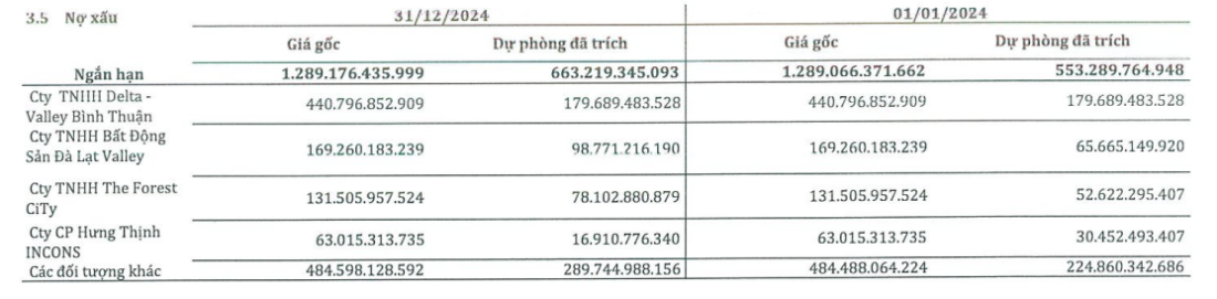 Danh sách nợ xấu công ty thép này xuất hiện nhiều cái tên doanh nghiệp bất động sản quen thuộc như Công ty TNHH Delta - Valley Bình Thuận (441 tỷ đồng), Công ty TNHH Bất động sản Đà Lạt Valley (169 tỷ đồng), Công ty TNHH The Forest City (132 tỷ đồng) và các đối tượng khác phải thu 484 tỷ đồng. Đây đều là các công ty con của CTCP Tập đoàn Đầu tư Địa ốc No Va (Novaland - mã chứng khoán NVL).