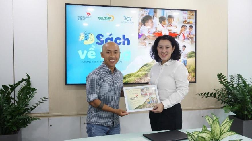 Ban lãnh đạo Tiến Phước Group và Quỹ JOY Foundation tại buổi ký kết tài trợ cho chương trình “Sách về làng”. Ảnh: D.N