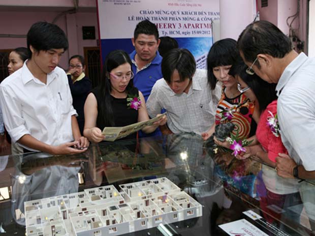 Sáng 15.9, nhiều người đến xem thiết kế chi tiết căn hộ dự án Cheery 3 Apartment (huyện Hóc Môn, TP HCM) với giá bán thấp nhất là 625 triệu đồng một sản phẩm. |