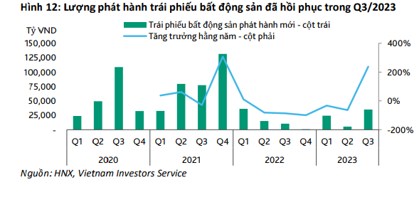 Phát hành trái phiếu bất động sản cũng tăng đáng kể 237% so với cùng kỳ năm trước trong quý 3/2023, từ mức đáy của quý trước đó (Hình 12). 78% lượng trái phiếu này được phát hành bởi Vingroup, Nam Long và Masterise. Các chủ đầu tư này đang triển khai các dự án tại Hà Nội và TPHCM, tiếp tục được hưởng lợi từ nhu cầu người mua nhà lớn.