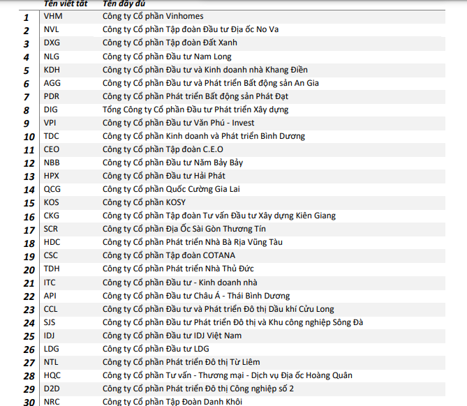 Danh sách top 30 công ty bất động sản nhà ở niêm yết về doanh thu.