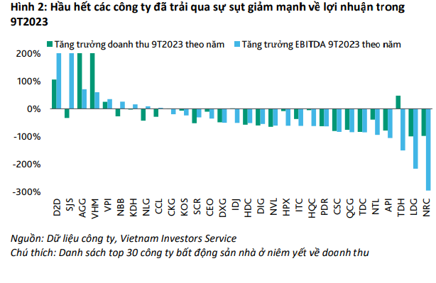 Chỉ một số ít chủ đầu tư như VHM, AGG, NLG và KDH ghi nhận tăng trưởng EBITDA (chỉ số tài chính cho biết lợi nhuận trước lãi suất, thuế, khấu hao và tổn thất giá trị) trong 9 tháng đầu năm 2023 (Hình 2), nhờ bàn giao các dự án lớn có kết quả bán hàng tốt từ năm trước. Các dự án này nằm ở các thành phố loại 1 và vùng ngoại ô, nơi có nhu cầu nhà ở cao và không gặp trở ngại pháp lý.