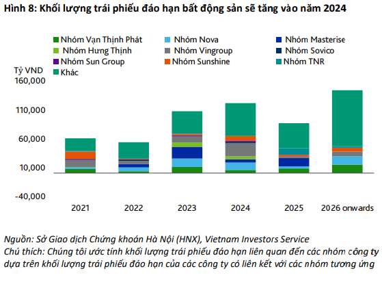 Ngoài ra, khối lượng trái phiếu đáo hạn đáng kể khoảng 114 nghìn tỷ đồng/năm trong 2023-2024 sẽ tiếp tục gây ra rủi ro tái cấp vốn (Hình 8).