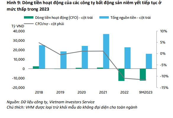 Trong khi đó, dòng tiền hoạt động kinh doanh đã giảm mạnh kể từ năm 2022 do hoạt động mở bán mới suy giảm (Hình 9), dẫn đến nguồn tiền mặt sụt giảm.