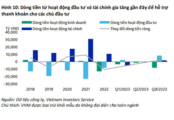 Sau khi trải qua sự suy giảm nguồn tiền mặt từ năm 2022, tình trạng thanh khoản của các chủ đầu tư đã cải thiện đôi chút trong quý 3/2023 do sự thiếu hụt dòng tiền hoạt động đã được bù đắp bởi sự gia tăng đáng kể trong dòng tiền từ hoạt động đầu tư (CFI) và tài chính (CFF) (Hình 10).