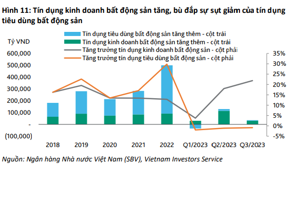 Các ngân hàng tư nhân cũng đang cung cấp vốn để hỗ trợ các chủ đầu tư tái cơ cấu dự án và nợ 3, dẫn đến tín dụng kinh doanh bất động sản tăng 22% trong 9 tháng đầu năm 2023 (Hình 11). Mặt khác, tín dụng tiêu dùng bất động sản vẫn còn yếu.