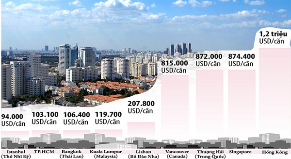 Cụ thể, giá căn hộ cao cấp tại khu trung tâm TP.HCM từ 7.500-12.000 USD/m2, chỉ bằng khoảng 16% so với Hồng Kông (45.500 USD/m2) - nơi giá nhà thuộc hạng đắt đỏ nhất thế giới. Trong khi đó, giá chung cư cao cấp và hạng sang hiện nay ở Hà Nội chỉ từ 3.000 - 5.000 USD/m2.