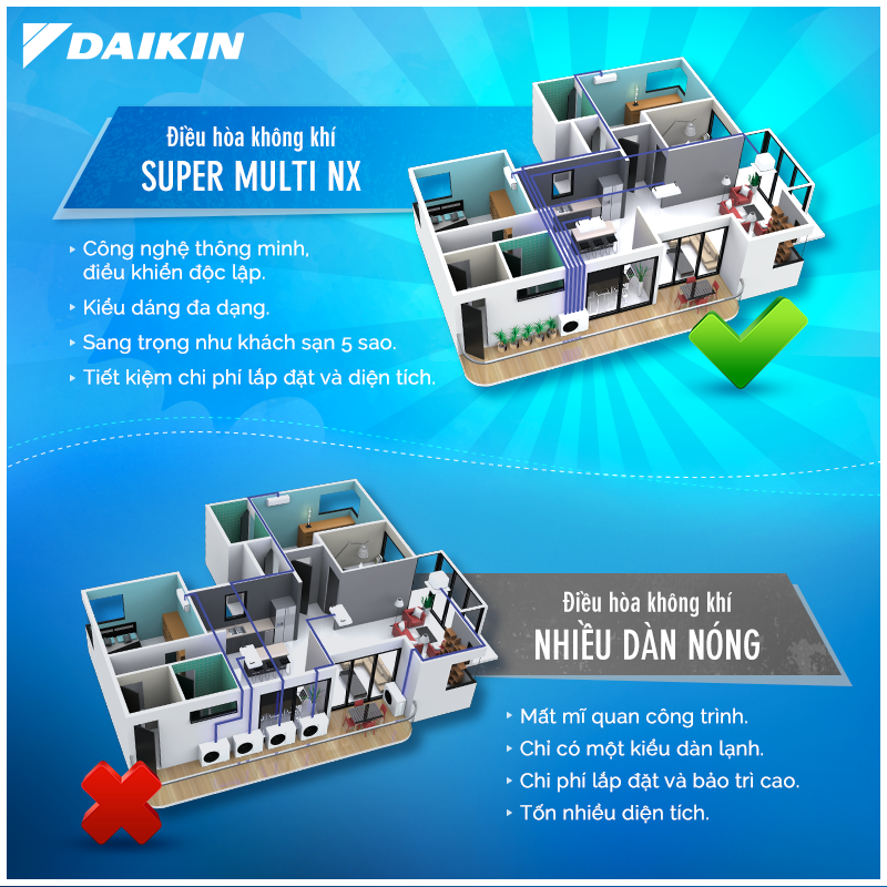 Với những ưu điểm nổi trội của mình, hệ thống điều hòa Super Multi NX của Daikin hứa hẹn không chỉ là hệ thống điều hòa không khí thông thường mà còn giúp các chủ nhân tạo nên được không gian sống đẳng cấp và khác biệt cho căn hộ của mình.