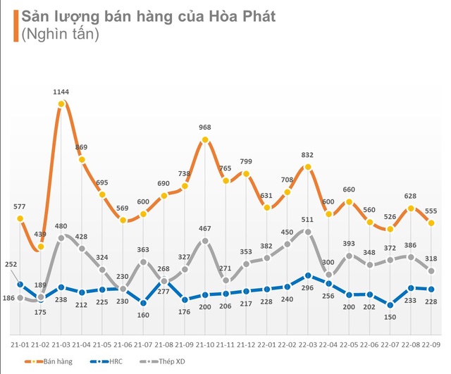 Ngay với Hòa Phát, báo cáo bán hàng giai đoạn tháng 7-9 chỉ đạt 1,71 triệu tấn thành phẩm, thấp hơn 16% so với cùng kỳ năm ngoái. Hòa Phát lý giải nhu cầu thị trường thấp trong tháng 9, kết hợp với mưa bão diễn biến phức tạp khiến việc tiêu thụ thép xây dựng gặp khó khăn.