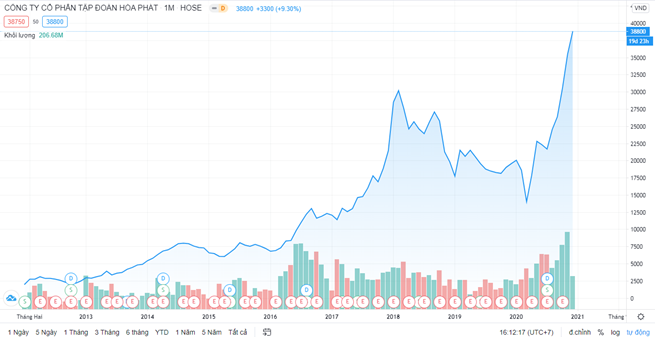 Giá cổ phiếu Hòa Phát vẫn đang tăng phi mã, hiện đang đạt 38.800 đồng/cổ phiếu, mức cao kỷ lục từ khi niêm yết đến nay (11/12).