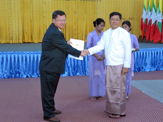 Chủ Tịch Ủy Ban Đầu Tư Myanmar – U Soe Thane trao Giấy Phép Đầu Tư dự án Hoang Anh Gia Lai Myanmar Centre cho Ông Lê Hùng, Tổng Giám Đốc HAGL Land. Ảnh: HAGL