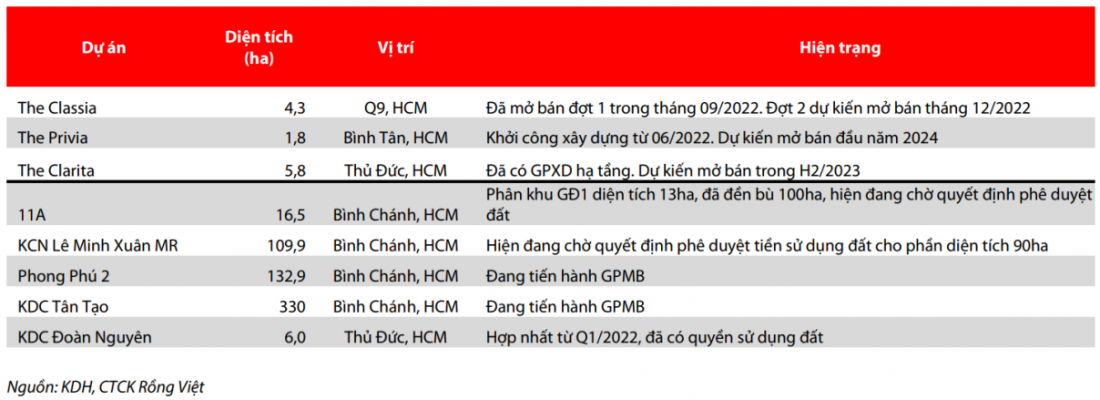 Dự án 11A - giai đoạn 1, đã đền bù 100% 13ha, hiện dự án trong trong giai đoạn chờ quyết định phê duyệt tiền sử dụng đất. Theo kế hoạch, dự án sẽ bắt đầu san lấp từ tháng 11/2022. Còn khu công nghiệp Lê Minh Xuân mở rộng dự kiến sẽ nhận quyết định thu hồi đất cho phần diện tích 90ha trong tháng 10/2022. Trong thời gian tới đây, KDH sẽ phải chờ quyết định phê duyệt tiền sử dụng đất, để có thể hoàn thành hết các nghĩa vụ tài chính và đủ điều kiện mở bán.