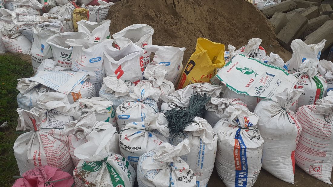 Những bao cát được gia cố kè bảo vệ bờ biển Cửa Đại