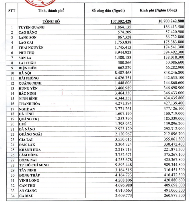 Chi tiết mức bổ sung cho từng tỉnh, thành phố ngân sách địa phương để tặng quà nhân dân nhân dịp kỷ niệm 80 năm Cách mạng tháng Tám và Quốc khánh 2/9 (Ảnh chụp màn hình văn bản)