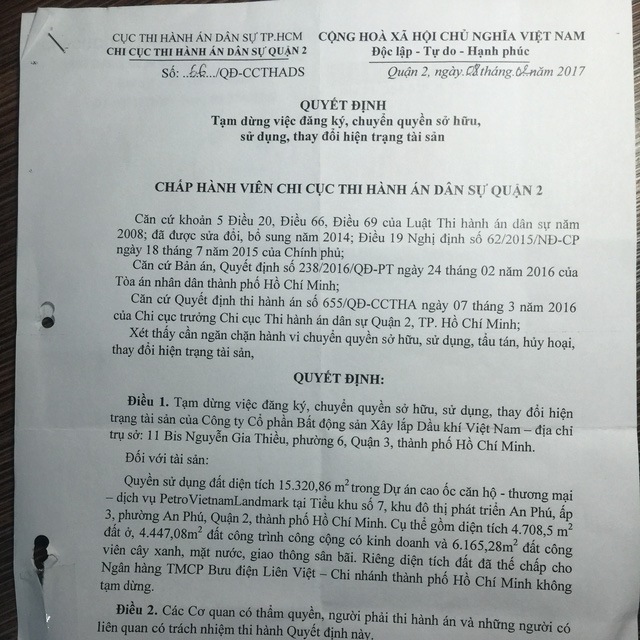 Theo quyết định của Chi cục thi hành án dân sự quận 2, sẽ tạm dừng việc đăng ký, chuyển quyền sở hữu, sử dụng, thay đổi hiện trạng tài sản của công ty CP BĐS Xây lắp Dầu khí Việt Nam, đối với quyền sử dụng diện tích 15.320,86m2 trong Dự án cao ốc - thương mại - dịch vụ PetroVietnam Landmark tại Tiểu khu số 7, khu đô thị phát triển An Phú.