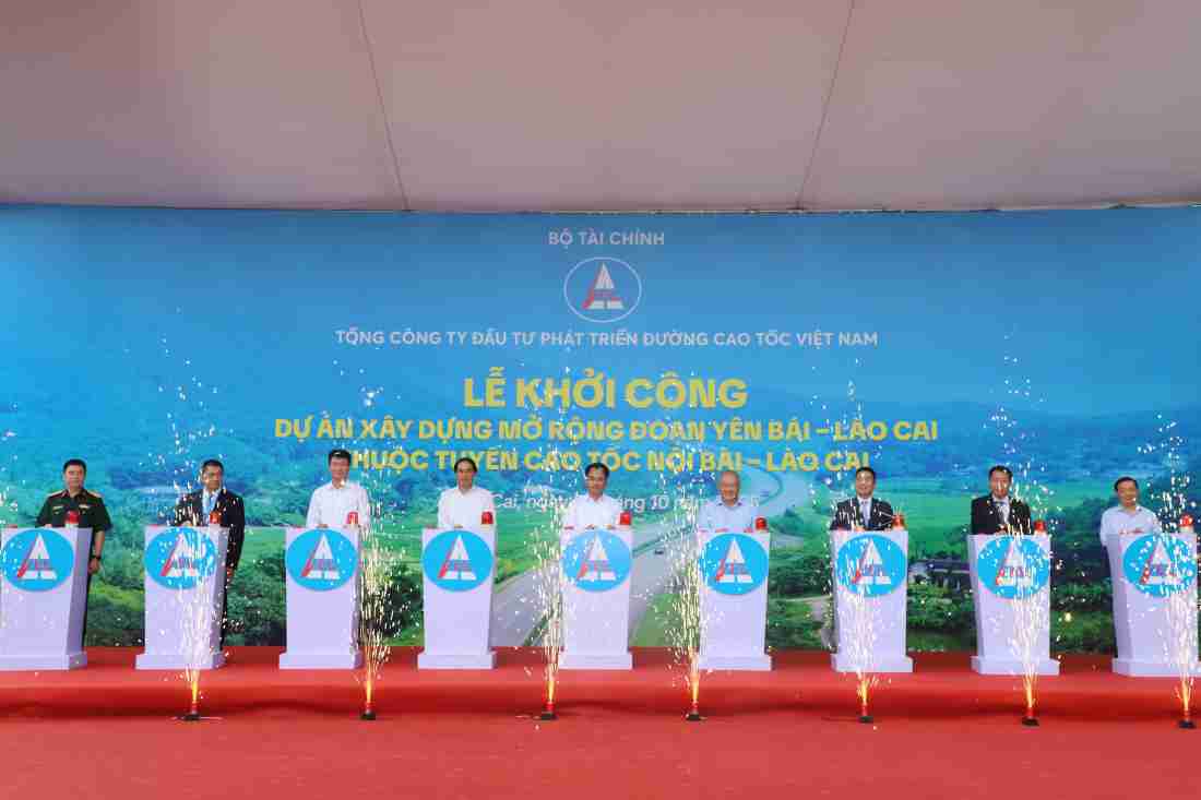 Các đại biểu thực hiện nghi thức bấm nút khởi công dự án xây dựng mở rộng đoạn Yên Bái - Lào Cai, thuộc tuyến cao tốc Nội Bài - Lào Cai.