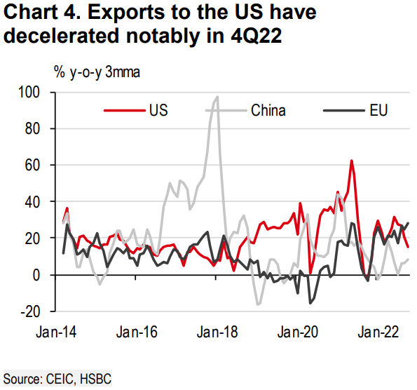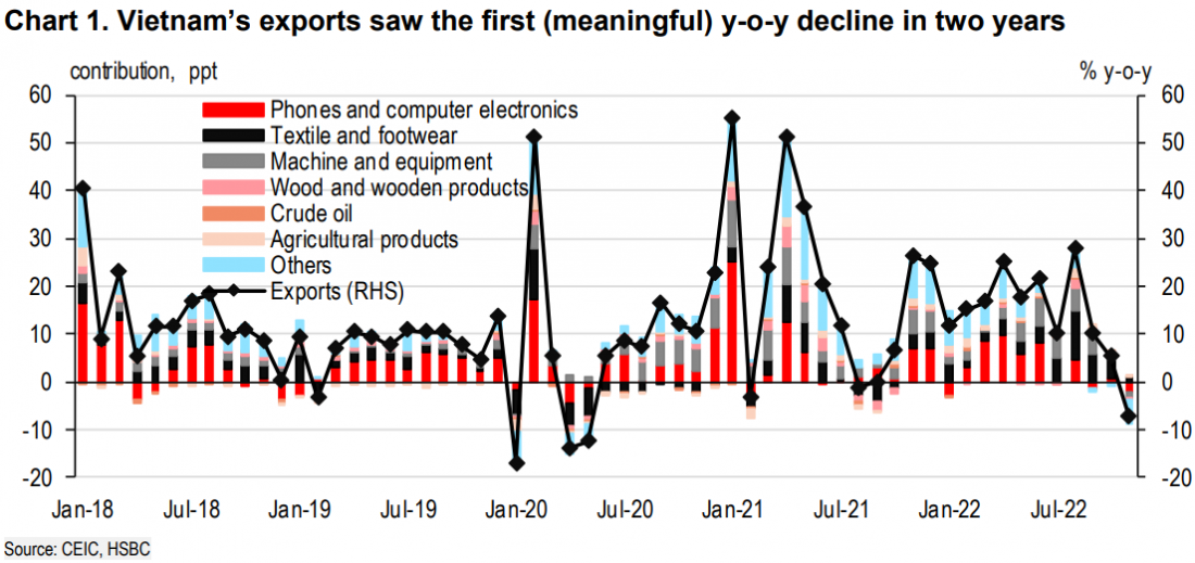 Trong tháng 11, lần đầu tiên trong vòng hai năm, Việt Nam chứng kiến mức sụt giảm đáng kể so với cùng kỳ năm trước trong tăng trưởng xuất khẩu, suy giảm ở tất cả các lĩnh vực. Xuất khẩu của Việt Nam tháng 11 giảm 7,4% so với cùng kỳ năm trước, giảm nhiều hơn so với dự báo của HSBC (-2,3%).