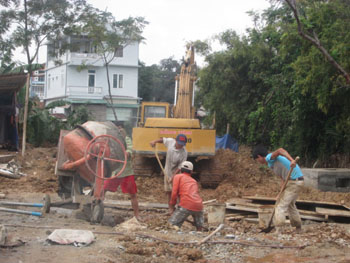 Công nhân Công ty TNHH Xây dựng Đồng Tâm đang xúc đá lẫn đất vào máy trộn bê-tông.