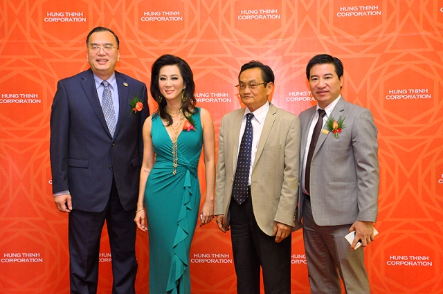 Ông Lê Thành Ân (ngoài cùng bên trái) và bà Nguyễn Cao Kỳ Duyên chụp ảnh lưu niệm cùng ông Nguyễn Đình Trung, Chủ tịch HĐQT kiêm Tổng Giám đốc Hưng Thịnh Corp (ngoài cùng bên phải) và khách mời.