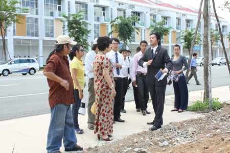 Khách hàng tham quan dự án The IJC Commercial Bình Dương. Hoạt động đầu tư bắt đáy khiến cho thị trường đất dự án giá rẻ vẫn thu hút được khách hàng trong thời điểm khó khăn. Ảnh: Quỳnh Mai.