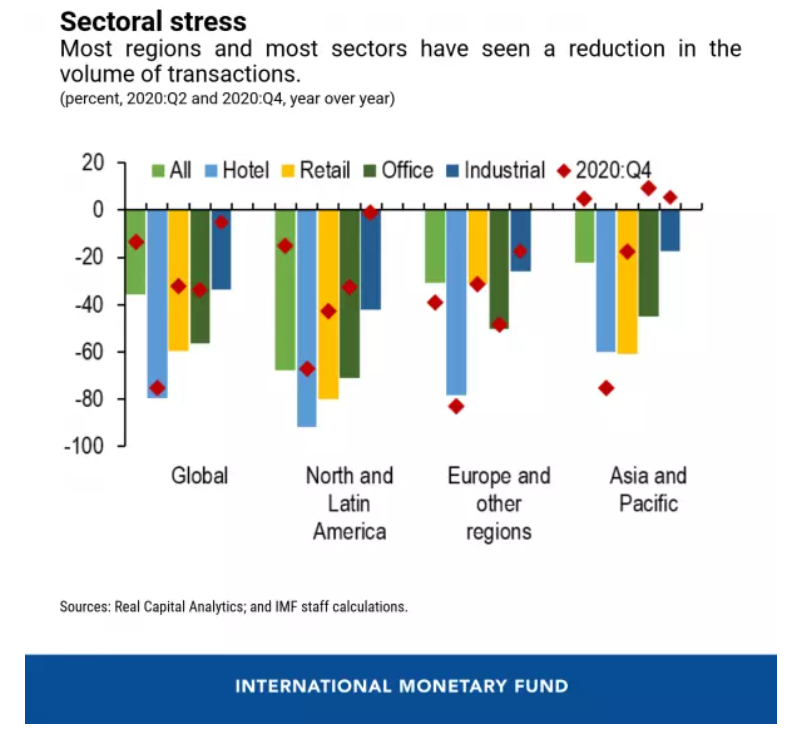 Ngoài tác động tức thời, đại dịch cũng đã làm mờ triển vọng đối với bất động sản thương mại, do sự xuất hiện của các xu hướng như sự suy giảm nhu cầu đối với bán lẻ truyền thống thay vì thương mại điện tử hoặc đối với văn phòng làm việc. Phân tích gần đây của IMF cho thấy những xu hướng này có thể phá vỡ thị trường bất động sản thương mại và có khả năng đe dọa sự ổn định tài chính.