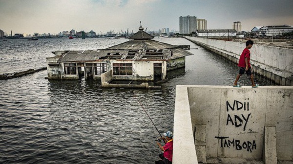 Một người đàn ông câu cá gần một đền thờ Hồi giáo đã bị ngập nước ở thủ đô Jakarta của Indonesia - Ảnh chụp màn hình New York Times