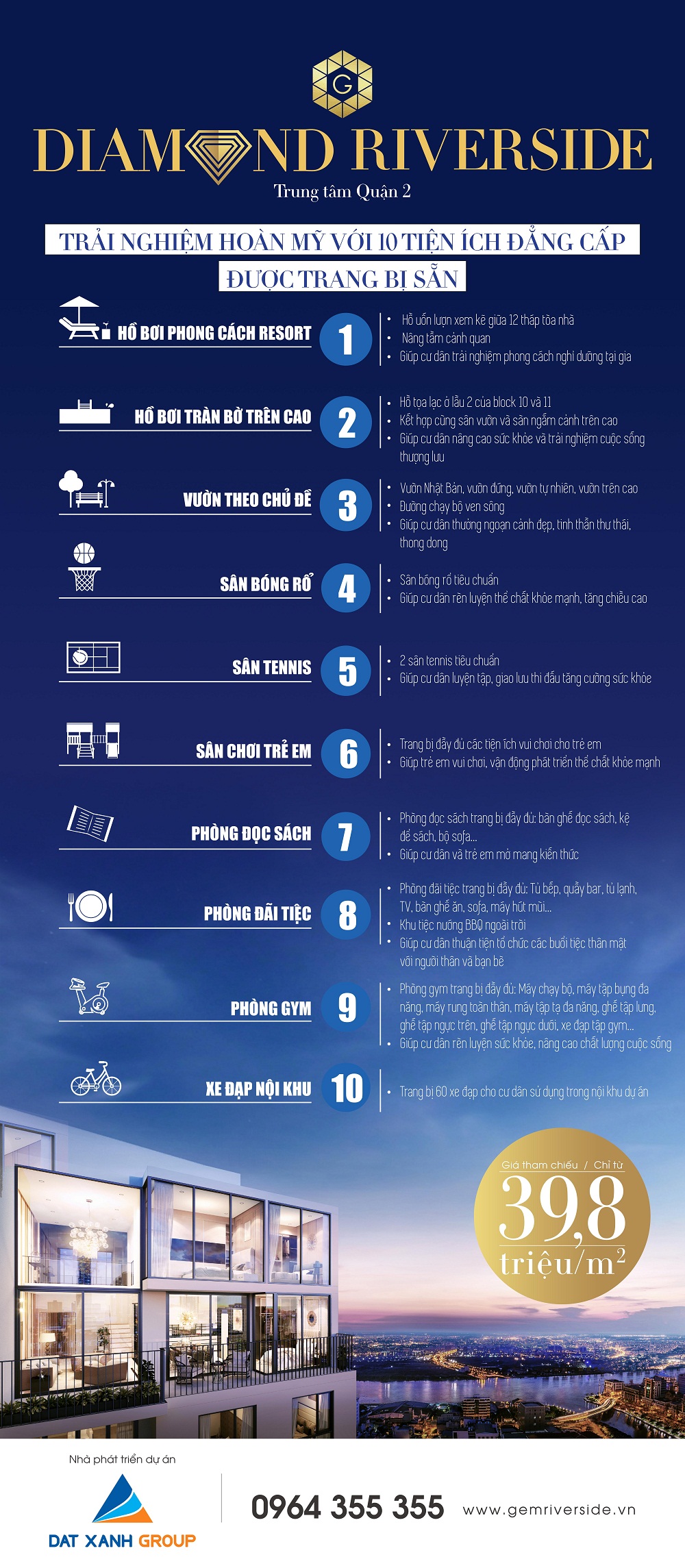 Có tầm nhìn ba mặt hướng sông, Diamond Riverside xứng đáng là chốn an cư mang phong cách nghỉ dưỡng cao cấp khi được Tập đoàn Đất Xanh đầu tư thêm 10 tiện ích, đem tới không gian sống “resort tại gia”.